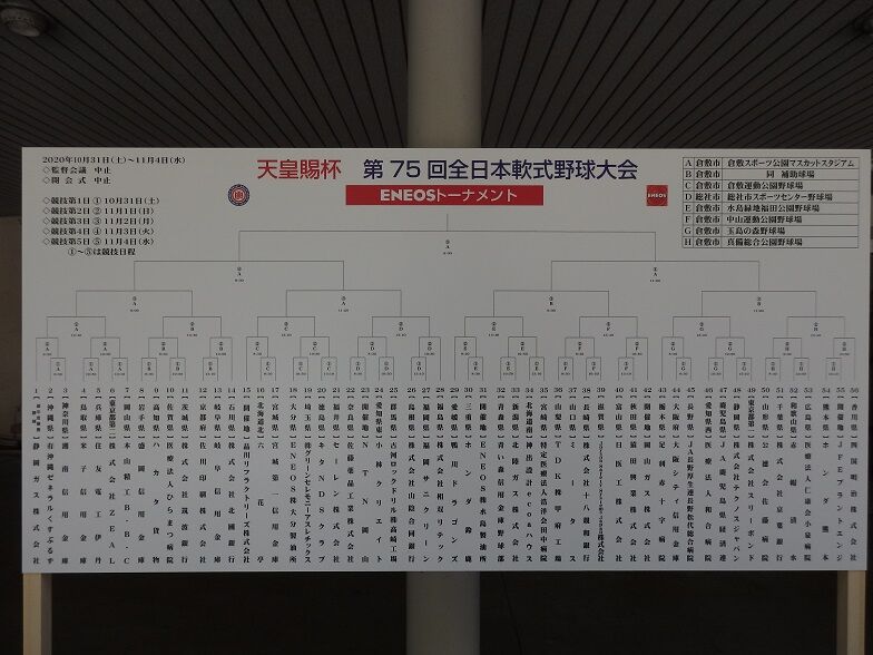 2020年11月25日 倉敷運動公園野球場 (倉敷市営球場) 方位:南住所:倉敷市四十瀬4両翼93m・中堅121m収容人数:ボックス席1,958人、内野席5,412人、外野席2,200人、計9,570人、 屋根:あり スコアボード:LED式、 照明:あり {観戦・撮影日:R02.11.01} 天皇賜杯第75回全日本軟式野球大会 準々決勝 (六花亭1-0ENEOS大分製油所)球場一覧(目次&リンク集)